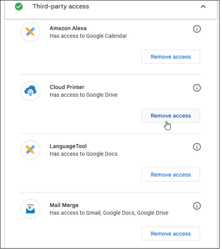 点击安全检查页面上的第三方访问类别,查看哪些服务可以访问您的Google帐户。要在此处查看有关条目的更多详细信息,请单击信息图标。否则,请单击删除访问权限以禁用该应用程序的所有谷歌服务。