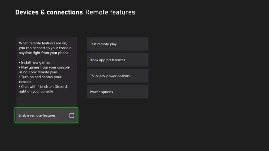 在使用远程播放之前,您必须在您的Xbox上启用该功能。打开设置>设备和连接>远程功能,然后选中启用远程功能旁边的框。然后,您可以点击测试远程播放按钮,以确保一切设置正确。