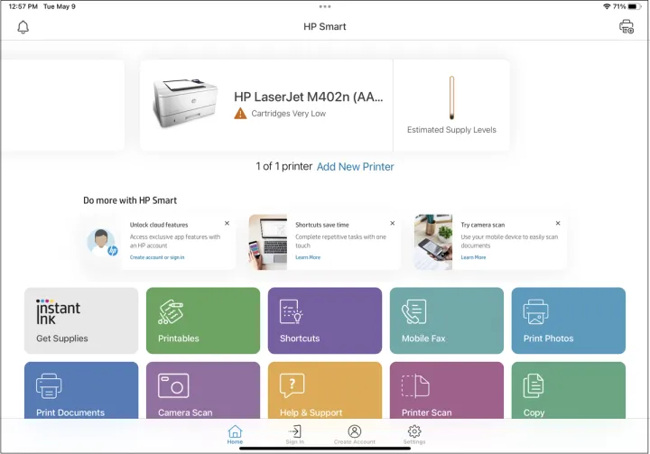 对于HP打印机,所有重要信息和命令都可以在一个屏幕上查看。您可以查看打印机的墨水量,还可以选择打印照片或打印文档开始打印。当您第一次做出选择时,系统会提示您登录或创建HP帐户。