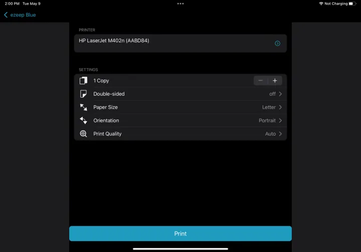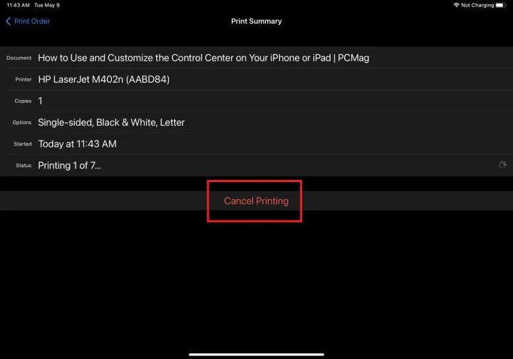 准备好后,点击屏幕右上角的打印按钮。由于打印输出是从iPad生成的,因此打印作业所需的时间可能会比通常通过计算机执行的时间更长。请注意,当打印作业正在运行时,您可以查看它,如果需要,甚至可以取消它。