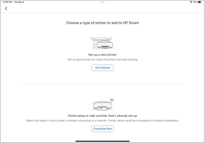 在下一个屏幕上,点击设置新打印机,并允许应用程序连接到您的本地网络上的设备。您可以点击开始设置新打印机,或点击立即完成添加已设置的打印机。一旦您做出选择,就可以选择您希望与该应用程序一起使用的打印机。
