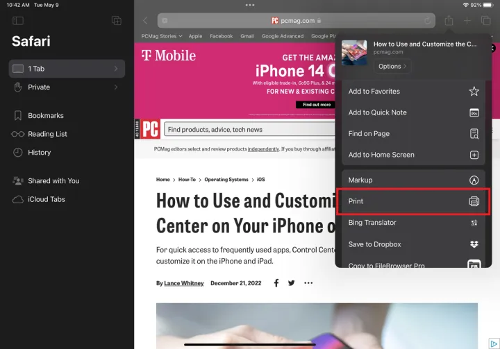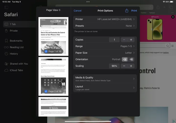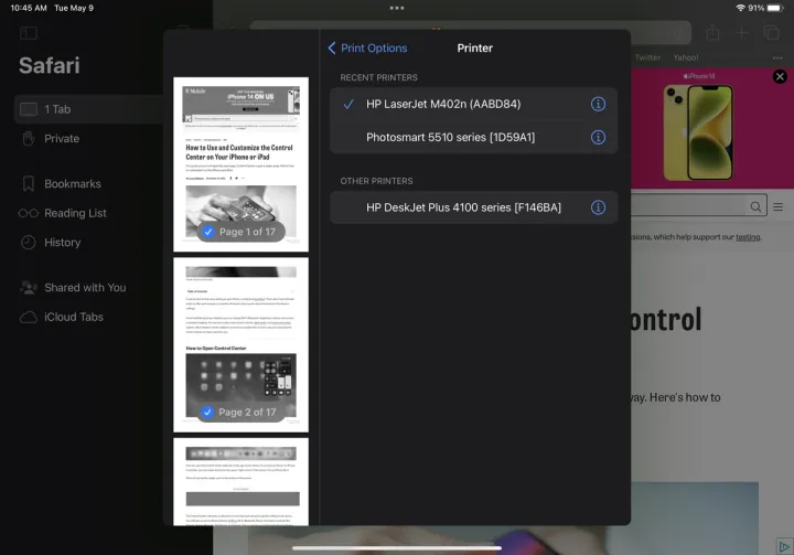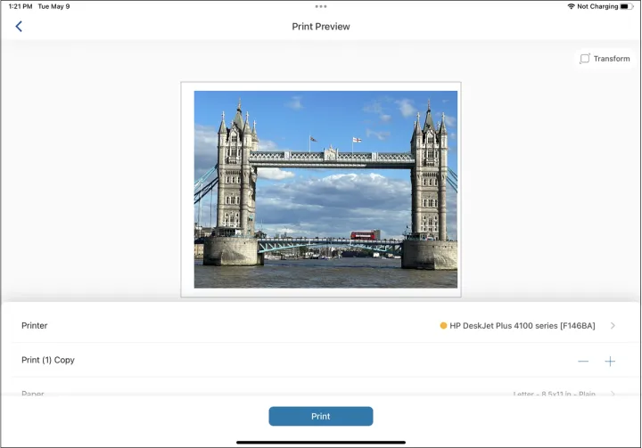 一旦您的打印机连接到您的网络,打印应该很容易。只需打开要打印的文档或网页即可。轻触共享图标,然后选择打印选项以显示一个对话框。您的默认打印机可能会显示在打印机字段中,否则,请点击该字段并选择要使用的打印机。