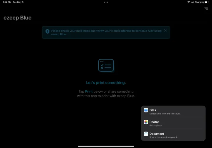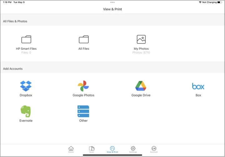 设置帐户后,您将进入查看和打印屏幕,您可以在其中选择要打印的文件。你甚至可以连接到Dropbox、Google Photos和Drive、Box等在线账户。
