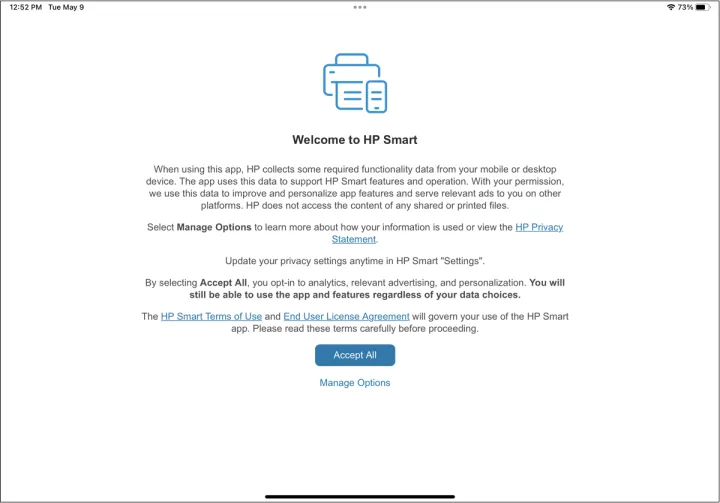 当您第一次打开HP Smart应用程序时,会出现一个欢迎屏幕,说明某些数据是从您的移动设备收集的。点击全部接受按钮以继续,或选择管理选项链接以防止收集特定类型的数据。