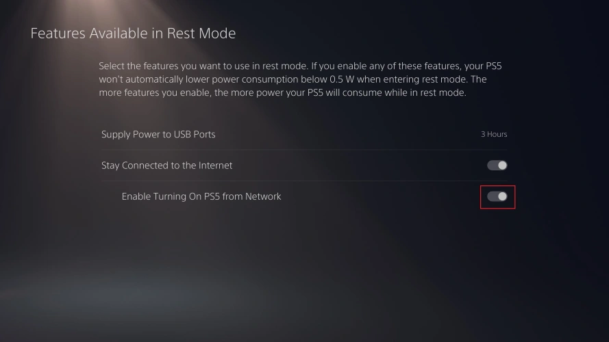 但是,如果主机完全关闭,远程播放将不起作用。为了使该功能更易于使用,您还应该启用REST模式。打开系统>省电>在REST模式下可用的功能,然后切换启用从网络打开PS5,这样您就不必在玩之前打开控制台。