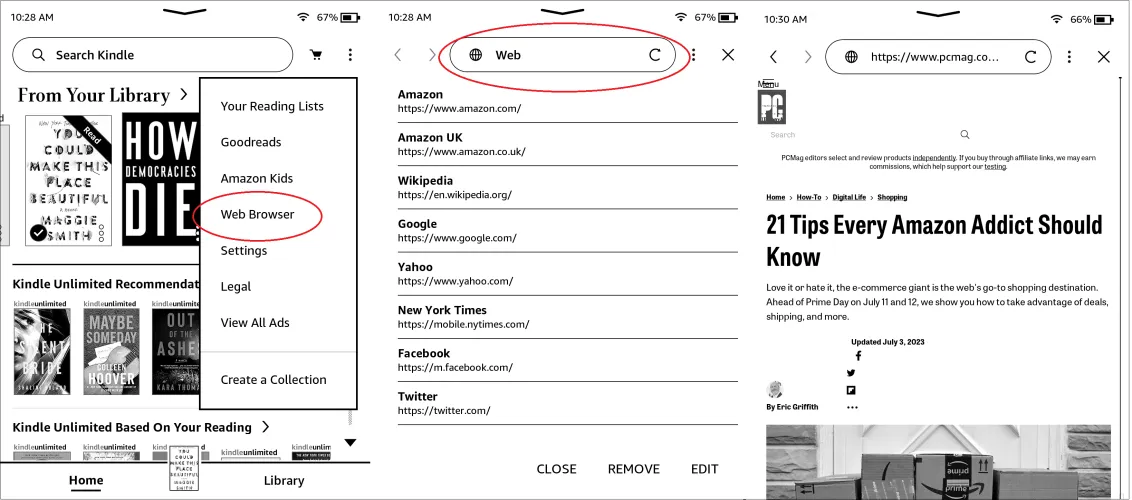 Kindle有一个网络浏览器。它还很初级,但在必要的时候,当你有Wi-Fi连接,但其他设备的电池续航时间较短时,它可能会很有用。点击Kindle屏幕右上角的菜单,然后选择Web Browser。这会弹出一个(相当慢的)浏览器;在顶部的菜单栏中输入您想要的URL。