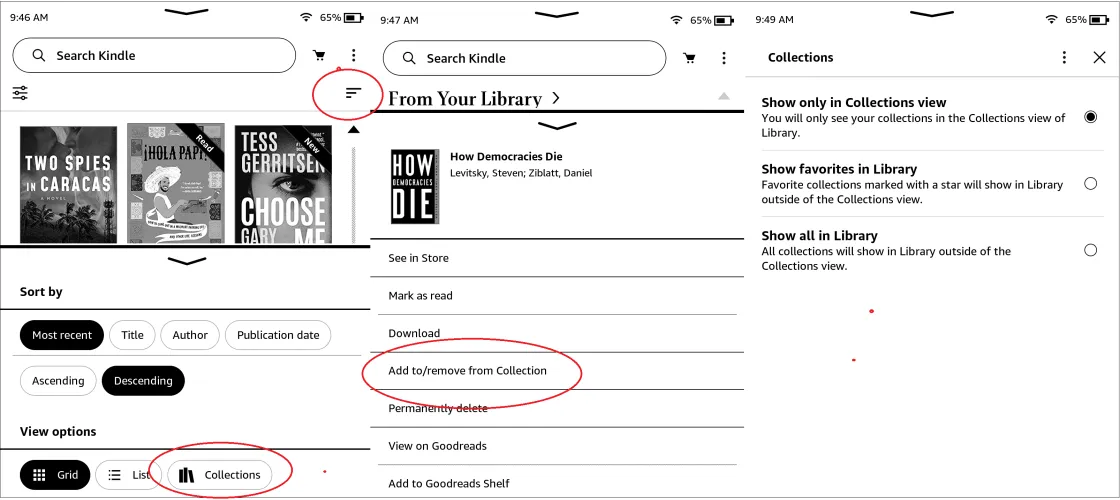 亚马逊允许你选择如何看待收藏品。转到设置>设备选项>高级选项>主页和库>收藏集以选择以下三个选项之一:仅在收藏集视图中显示、在库中显示收藏夹或在库中全部显示。