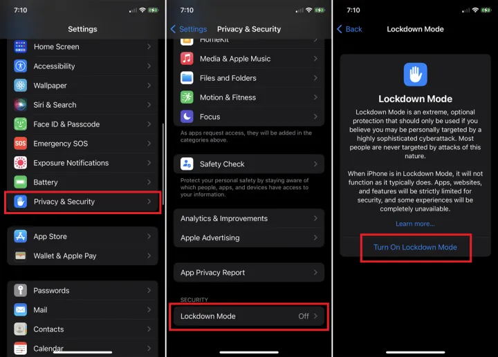 如果您认为您的设备是协同攻击的目标,您可以采取额外的安全措施来防止进一步的攻击。IPhone用户有锁定模式,可以在设置>隐私和安全>锁定模式下启用该模式来禁用某些功能。安卓用户可以注册谷歌的高级保护计划
