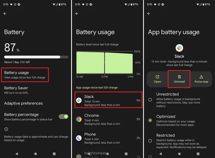 搜索你的应用程序列表,卸载你不认识的任何东西。你还可以检查设备的电池设置,看看哪些程序耗电量最大。如果你发现任何不应该消耗这么多电量的第三方应用程序,请立即卸载它们。