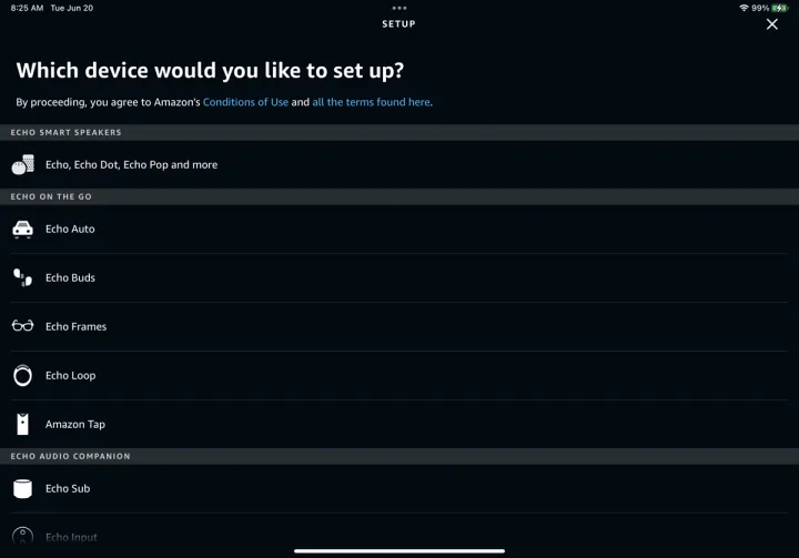 系统会询问您要设置哪种设备。在本例中,选择Amazon Echo。