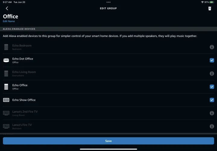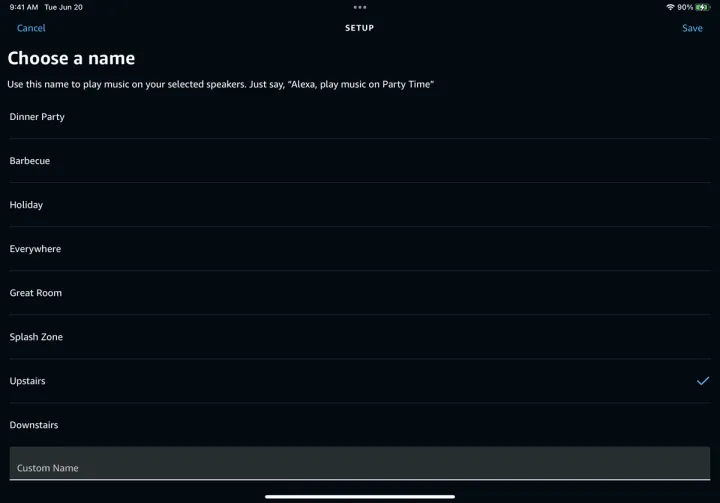 然后,您必须为多房间组选择一个名称。选择现有名称之一或向下滑动到底部,然后键入一个自定义名称。点击保存,您将返回到设备屏幕,在这里您可以看到您的新组。