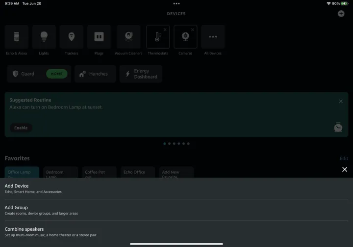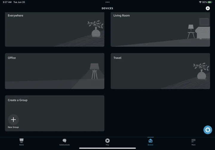 除了根据房间或位置将音乐定向到特定的组之外,您还可以创建一个多房间组,以便在其中播放您想要听的歌曲。要在Alexa应用程序中进行设置,请进入设备屏幕。单击加号(+)按钮,然后选择组合扬声器选项。