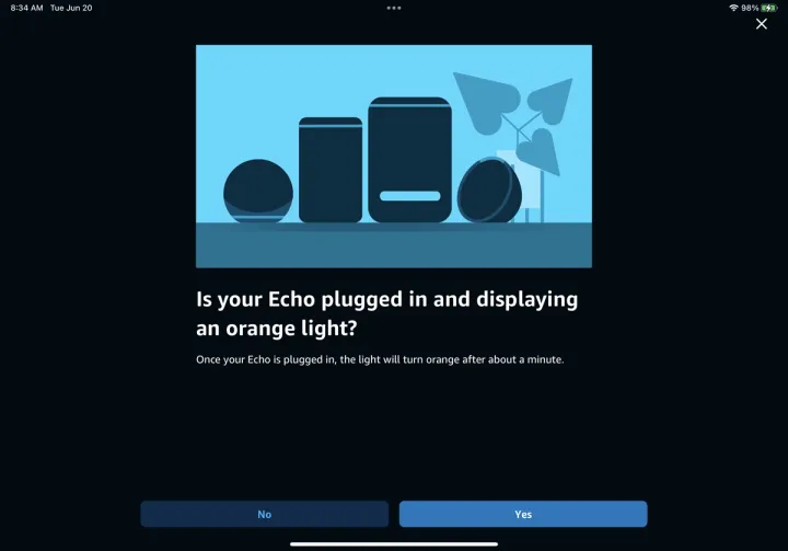 然后,这款应用程序会引导你完成安装过程。确保您的Echo设备已插入。如果你正在设置传统的Echo,请等待它的指示灯变成橙色,然后在应用程序中点击继续。如果指示灯没有变成橙色,按住操作按钮大约15秒,直到它变成橙色。然后在应用程序中点击是,当它询问你是否已插入Echo并显示橙色指示灯时。