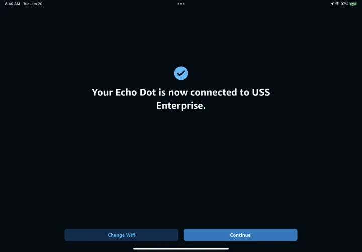 然后,您可能会看到一个屏幕,提示您确认Wi-Fi网络并输入密码。点击连接,应用程序会告诉你它已连接到你的网络。然后应该会弹出一条消息,指示您的Echo设备已连接,而Alexa则告诉您设备已准备好。若要确保Alexa正在监听您的新设备,请提出问题或提交请求。点击继续。