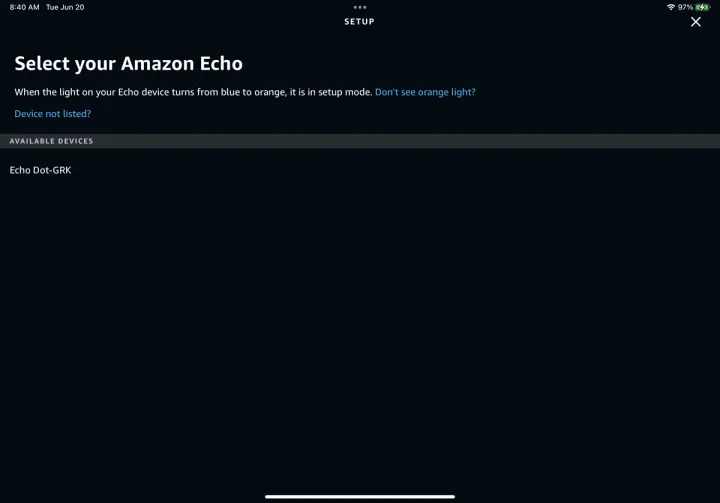 选择屏幕上列出的Echo设备。名称应采用Echo-XXX的形式,XXX由一系列三个大写字母表示。除非你仍在使用第一代Echo设备,否则Alexa应用程序会搜索并连接到你的Wi-Fi网络。