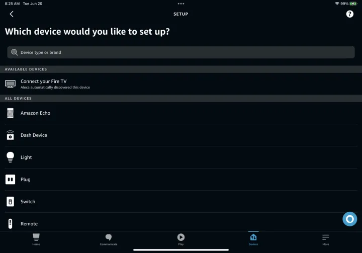您的第一步是设置设备。打开Alexa应用程序,然后点击底部的设备图标。选择右上角的加号(+)按钮,然后点击添加设备。