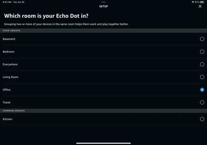 然后您可以为您的Echo指定一个位置。在同一房间中使用两个Echo设备有助于音乐播放和类似任务。选择正确的房间并点击继续。然后,这款应用程序可能会询问你的新设备的确切位置,以帮助了解当地的天气和交通情况。
