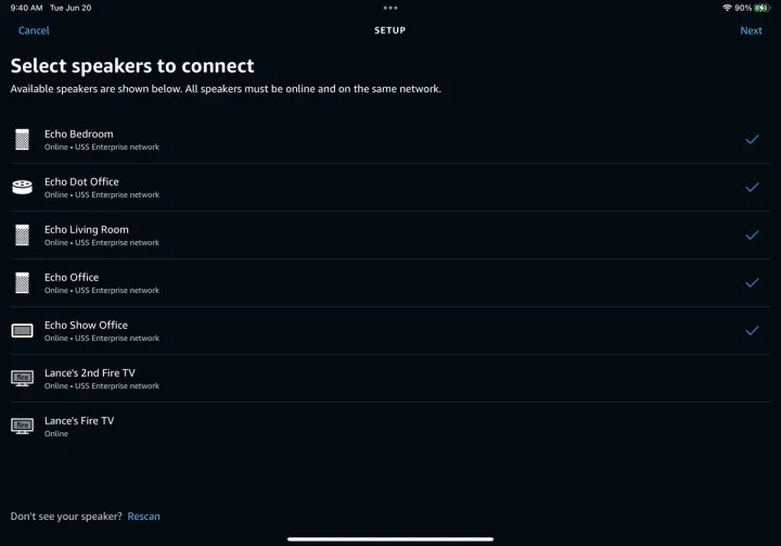 点击要添加到多房间设置中的Echo设备。确保所有扬声器都处于在线状态并连接到同一网络。如果您没有看到所有的Echo设备,请点击底部的重新扫描以再次查找它们。完成后,点击下一步。