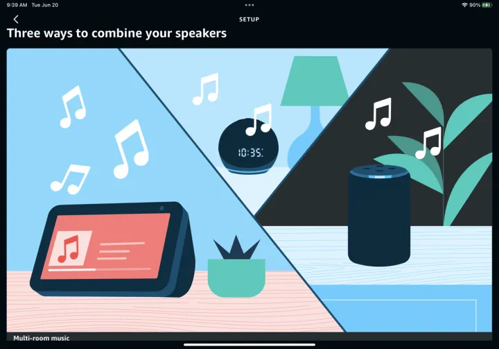 下一个屏幕告诉您有三种方式组合您的扬声器:多房间音乐、家庭影院和立体声对/低音炮。选择多房间音乐选项。