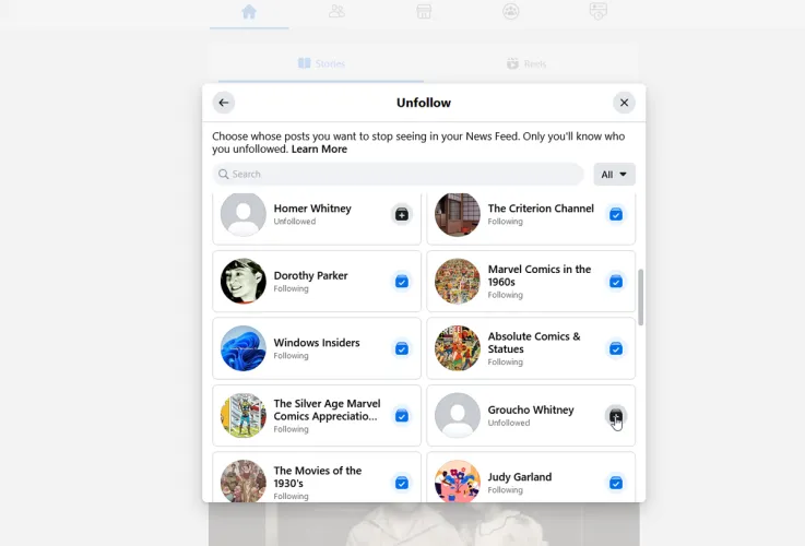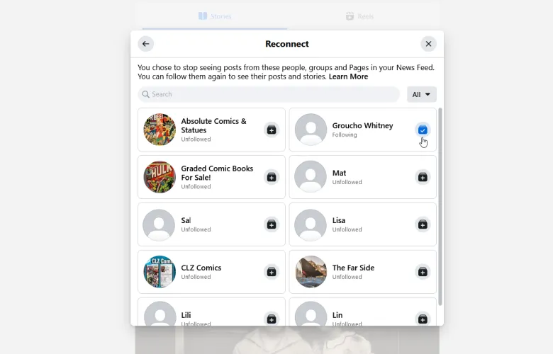 如果您已经准备好查看来自未关注的人的帖子,请在管理您的订阅源窗口中单击重新连接选项。选择要在您的新闻源中重新显示其帖子的人。关上窗户。