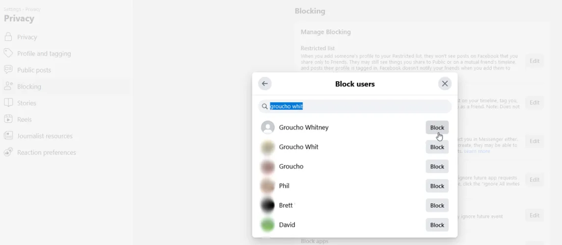 从左侧边栏中,选择隐私>阻止。单击阻止用户旁边的编辑按钮。单击添加到阻止列表的选项。开始输入您要阻止的人的姓名。当弹出正确的名称时,单击阻止按钮。