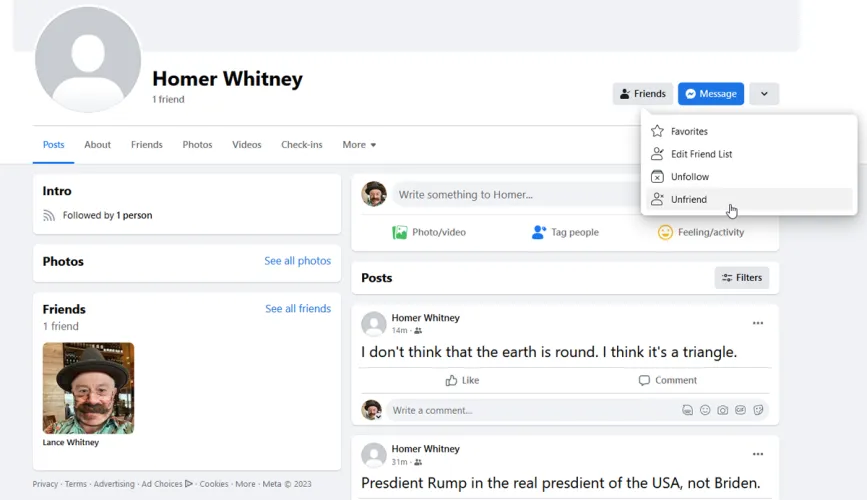 最后,通过取消好友关系,你可以和对方彻底分手(至少在脸书上是这样)。通过在页面顶部的搜索字段中搜索该人的名字来查找它。在显示人员姓名时选择该姓名。在该人的个人资料页面上,单击Friends按钮,然后从下拉列表中选择UnFriend。