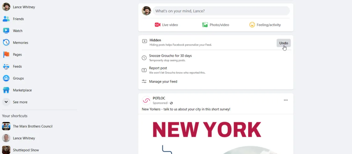 再一次,Facebook提供了一些额外的选择。如果您改变主意,请单击撤消按钮以禁用休眠操作。单击报告以报告攻击性或不适当的帖子。