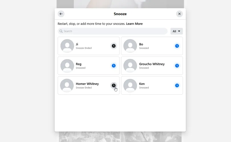 接下来,你可以一次将多个人的帖子打盹,而不打盹那些你之前打盹的人。在Manage Your Feed窗口中,单击Snooze选项。选择要暂停或取消暂停的人员,然后关闭窗口。