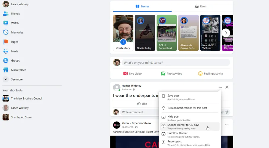 如果你继续看到某人不想要的帖子,你可以立即让他打盹30天。此操作将此人的帖子发送到Facebook炼狱,在那里他们的帖子在接下来的30天内不会出现在您的News Feed中。要做到这一点,请点击帖子旁边的省略号,并选择Snooze X for 30天选项。