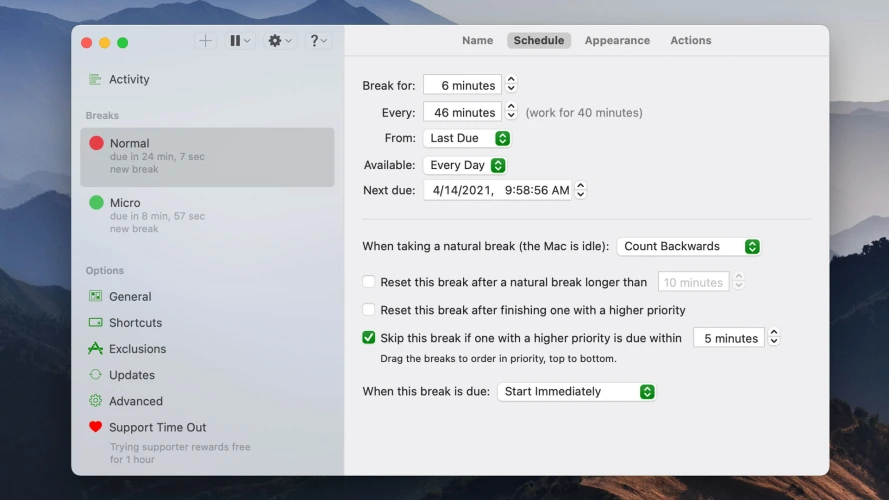 如果你在一家公司工作,了解休息时间的规定,并遵守这些规定。如果你是个体户,白天给自己留出足够的时间远离电脑屏幕和手机。一个午餐时间和两个15分钟的休息时间似乎是美国全职员工的标准时间。对于以电脑为基础的工作和其他久坐不动的工作,每隔一段时间站起来活动一下,让你的血液循环起来很重要,至少每小时一次。它还有助于定期将你的视线从屏幕上移开,即使是10到20秒的微小休息。