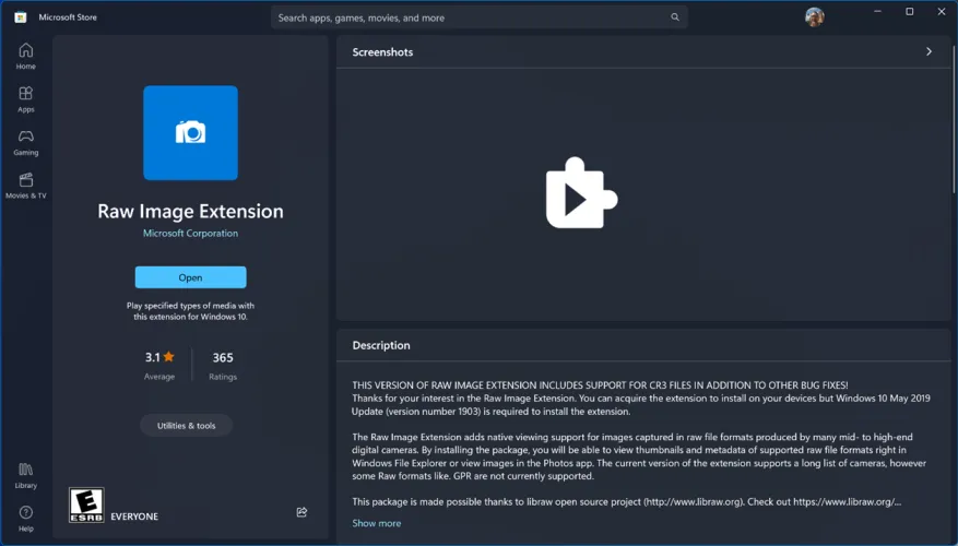 奇怪的是,如果你在商店的原始图像扩展应用程序条目中点击打开,电影和电视应用程序就会打开。如果商店入口按钮显示为Install而不是Open,点击该按钮即可在文件资源管理器中查看原始图像。你可以通过访问微软使用的源程序的网页来查看支持哪些摄像头型号:LibRaw
