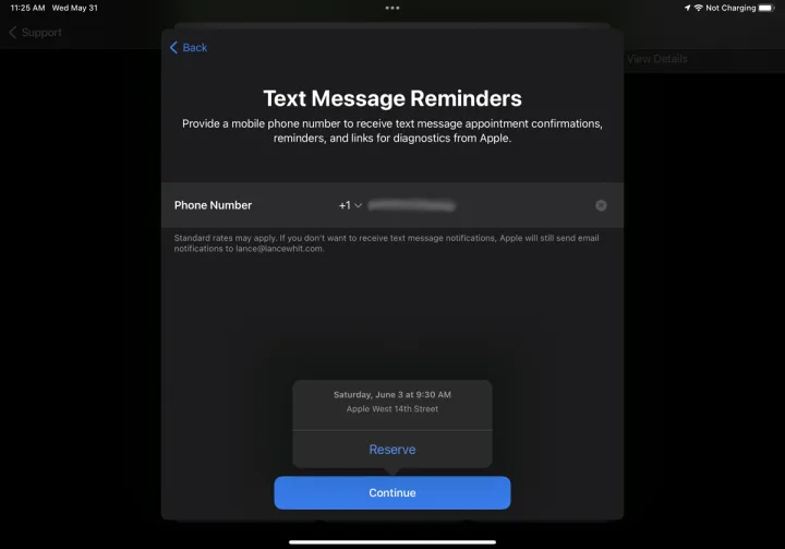 在下一个屏幕中,输入您的电话号码,以接收有关约会的短信提醒。点击继续,然后点击保留以进行预约。您还会收到一封确认电子邮件。如果您需要取消或重新安排约会,请单击电子邮件中的链接以管理我的预订。