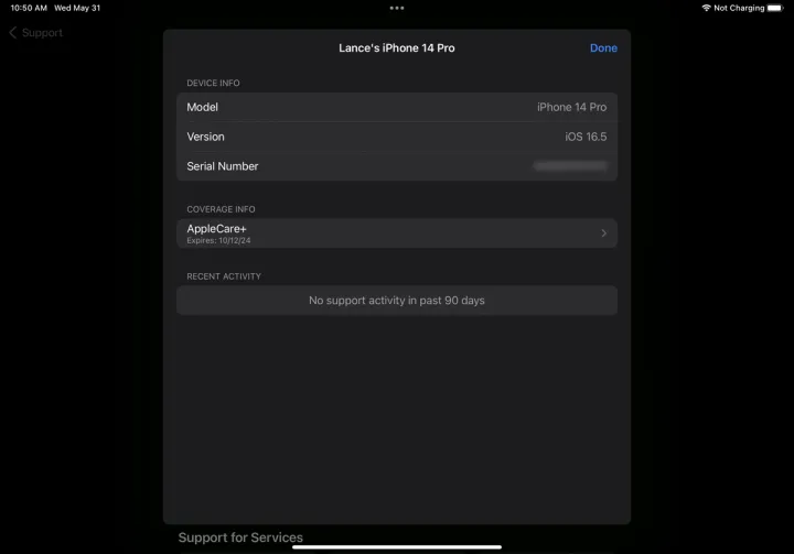 在继续之前,您可能希望检查损坏或缺陷产品的保修范围,以确定您是否仍在保修范围内。要在特定产品的某个支持页面上执行此操作,请点击设备详细信息项目名称下的链接。服务范围信息部分将告诉您设备是否仍在保修期内或AppleCare+内。