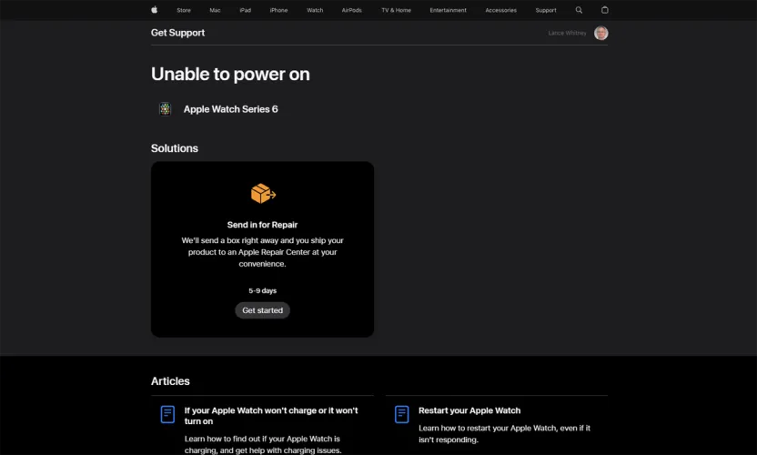如果您尚未使用您的Apple帐户登录,系统将要求您登录。生成的页面应该显示您拥有的产品。根据问题的不同,你会有几个选择,包括将你的产品邮寄给苹果公司进行维修,把它放在苹果商店,与支持代表聊天,或者通过电话与某人交谈。选择您的首选选项并按照所需步骤进行设置。