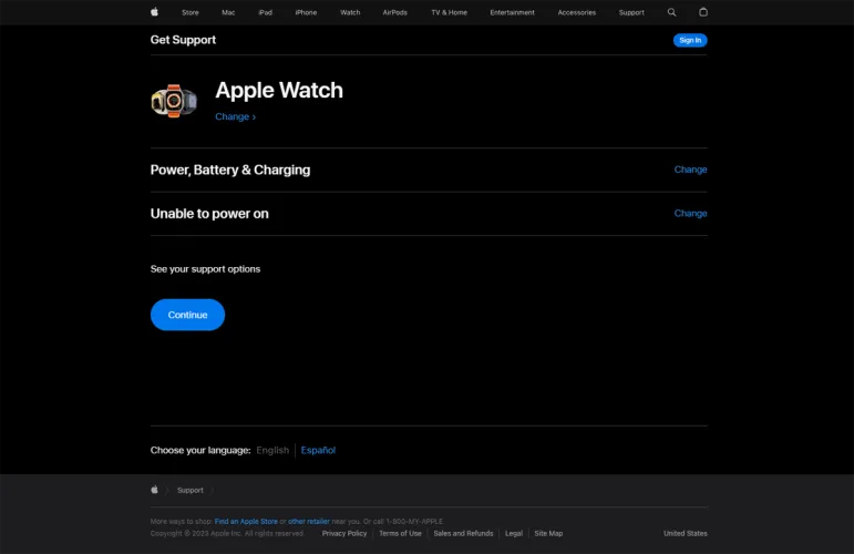 与移动应用程序类似,Get Support页面提供了更多关于该产品的类似文章和资源的链接。继续深入研究主题和副主题,直到找到问题所在。要直接与Apple联系,请在查看您的支持选项部分中单击下的继续按钮。(美国客户的苹果支持电话号码是1-800-275-2273。)