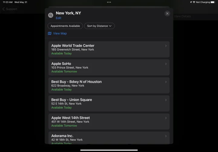 在下一个屏幕上,该应用程序将根据您的位置自动找到最近的服务中心。如果位置服务被禁用,或者您希望指定其他位置,请在顶部键入城市或邮政编码。结果将显示附近的苹果商店以及其他苹果授权的服务提供商。选择您要使用的商店。