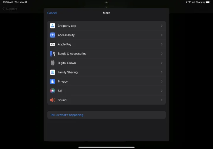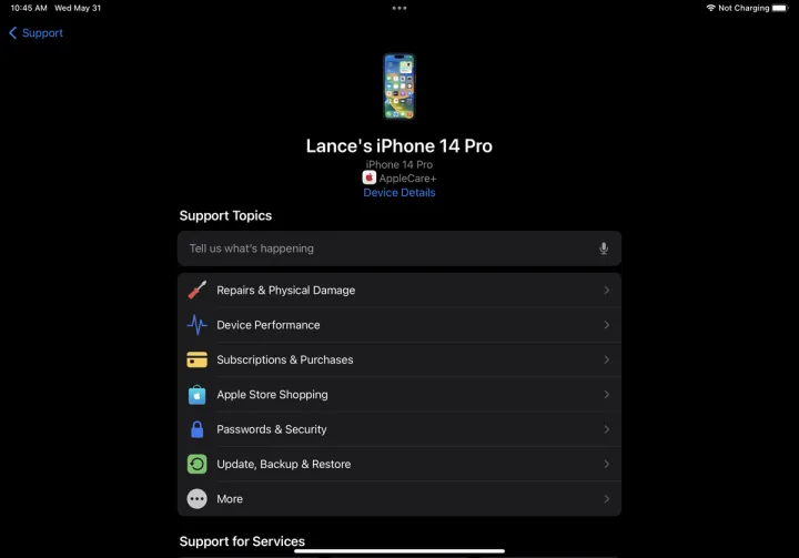 Apple Support应用程序向您显示与您的设备相关的常规故障排除主题。例如,点击iPhone的条目,就会提供以下主题的链接:维修和物理损坏;设备性能;订阅和购买;苹果商店购物;密码和安全;以及更新、备份和恢复。选择您的Apple TV会显示设置和配置、音乐、电影和电视节目以及互联网和流媒体等主题。选择AirPods这样的物品会导致诸如音频和声音;丢失或丢失AirPods;电源、电池和充电;配对和连通性;以及物理或液体损坏等主题。