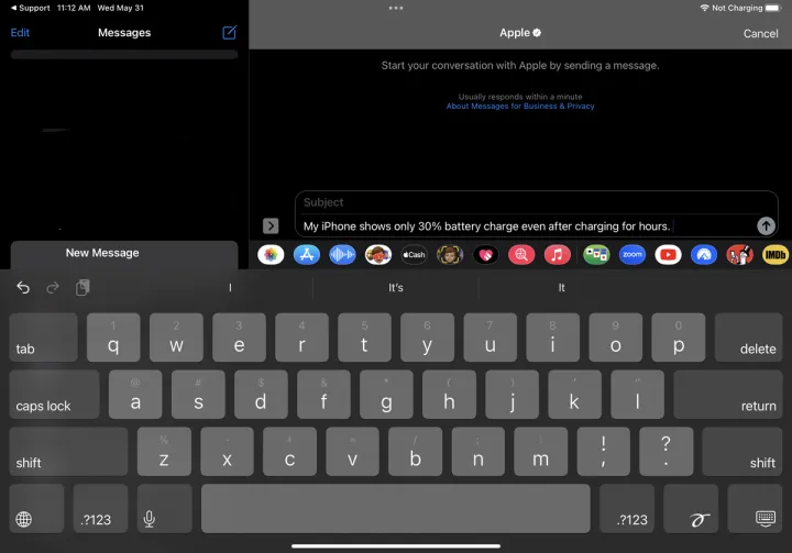 要获得苹果支持代表的帮助,请点击屏幕底部的消息按钮。IMessage中会打开一个聊天窗口,您可以在其中通过描述问题并发送消息来开始对话。