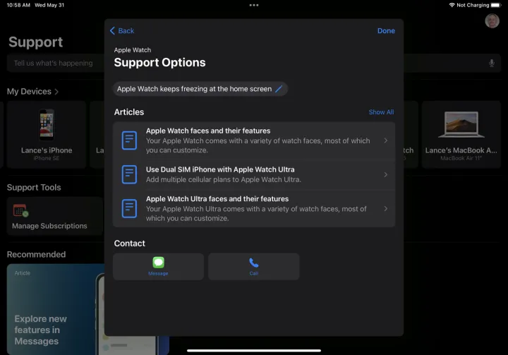 但让我们假设您正在尝试解决一个技术问题。找到最能描述该问题的问题后,选择该问题进行深入分析。结果会有所不同。您可能会被直接带到推荐的支持文章,其中包含可供您遵循的故障排除步骤。或者你可能会看到几篇推荐文章的链接。点击您想要阅读的内容。在大多数情况下,该应用程序还会提供联系苹果支持人员的选项。