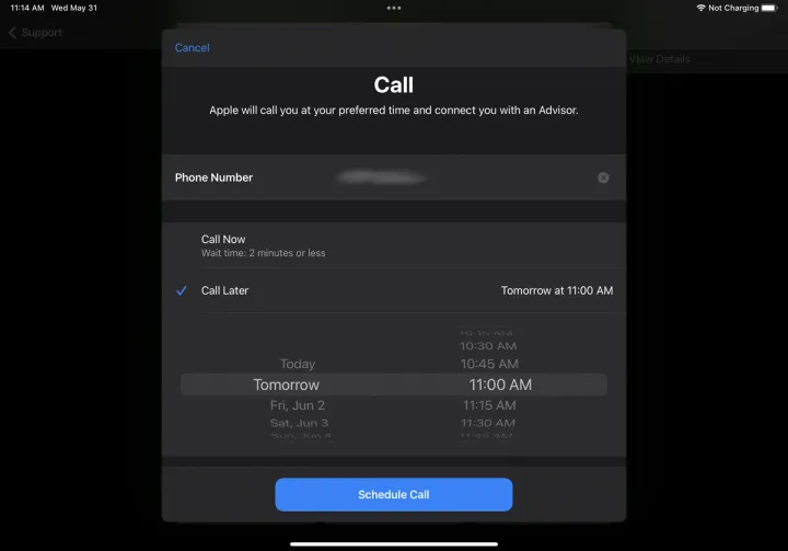 如果您更愿意通过电话与某人通话,请点击底部的呼叫按钮。然后,你可以选择让苹果现在给你打电话,或者安排一个日期和时间以后给你打电话。准备好后,点击Call Now或Schedule Call。