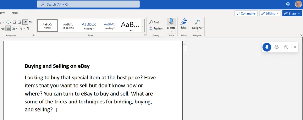 如果您订阅了Microsoft 365,请启动Microsoft Word并打开文档。将光标放在要开始听写的位置。单击主页功能区上的口述图标。第一次执行此操作时,Word可能会请求允许使用您的麦克风。授予许可并开始发言。
