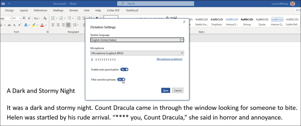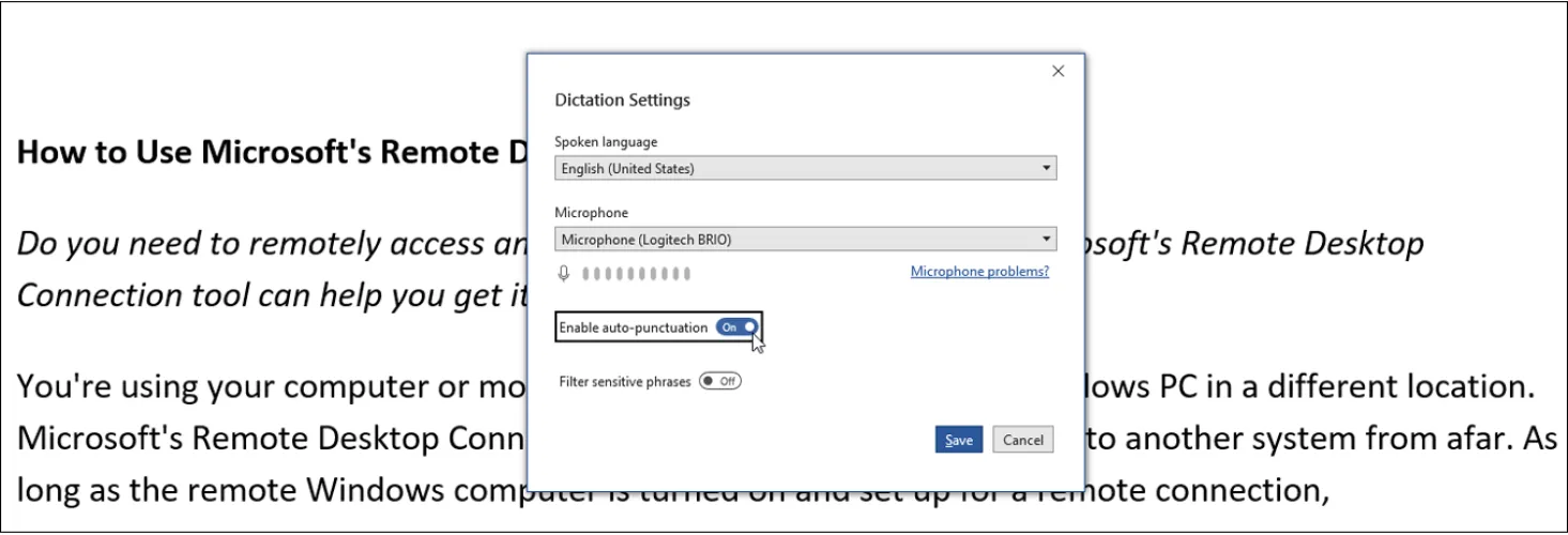 激活该工具后,单击Microsoft口述小工具栏上的设置图标。在这里,您可以更换和测试麦克风,以确保您的话被拾取。启用自动标点符号,以便您的听写自动包括句点、逗号和其他标记,而无需您说出它们。