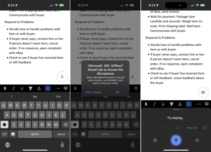 您的iPhone、iPad和Android设备提供了可通过键盘访问的内置听写功能。这些工具支持Microsoft 365应用程序和其他基于文本的程序。要在Office文档中听写文本,请在任何区域点击以显示键盘并选择麦克风图标。然后,您可以口述想要添加的单词。轻触屏幕上的任何区域即可停止听写。