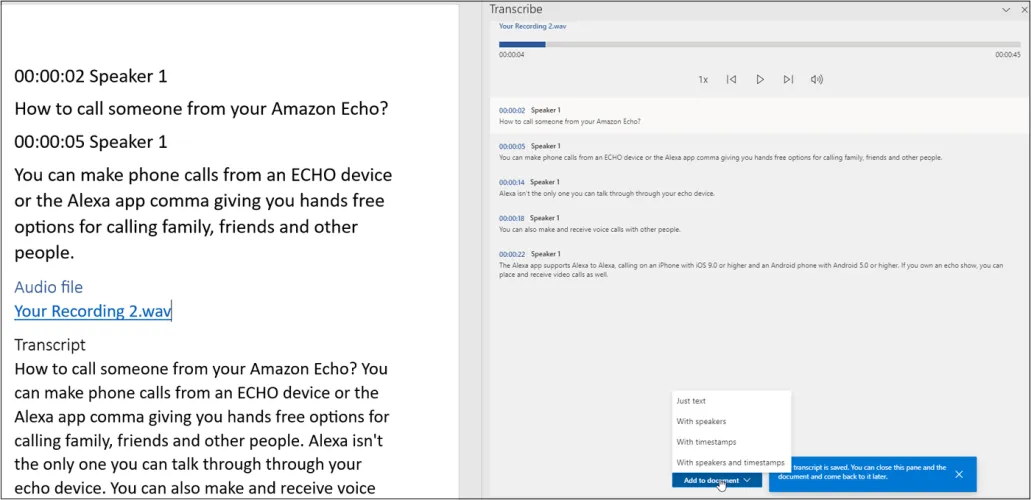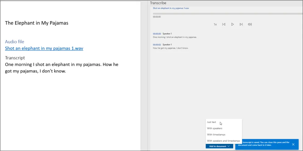 选择要导入的文件。在出现转录的单词后,单击播放按钮进行收听。单击Add to Document,您可以选择仅添加文本、添加带有发言者姓名的文本、添加带有时间戳的文本或添加带有发言者姓名和时间戳的文本。选择所需的选项,文本就会出现在文档中。