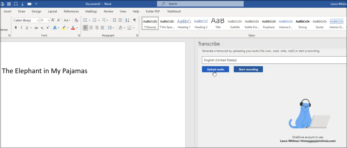 Microsoft Word还提供转录功能,您可以录制文字并将其另存为音频文件(.wav、.mp4、.m4a或.mp3)或上传现有的音频文件。然后您可以将转录的单词导入到当前文档中。要尝试此操作,请单击口述按钮上的向下箭头,然后选择转录。在转录侧边栏中,单击上传音频。