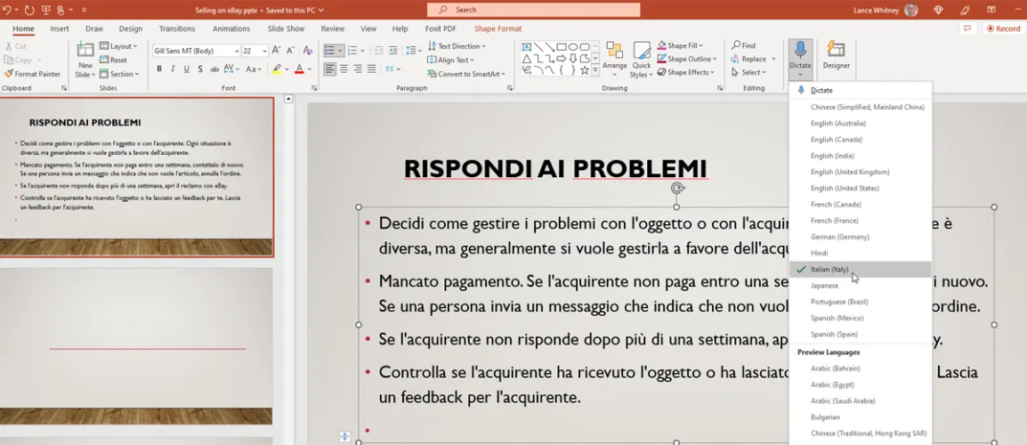 就像Word一样,PowerPoint也可以处理其他语言的听写。要尝试此操作,请单击“听写”按钮上的向下箭头,选择要听写的语言,然后说出要添加的单词。