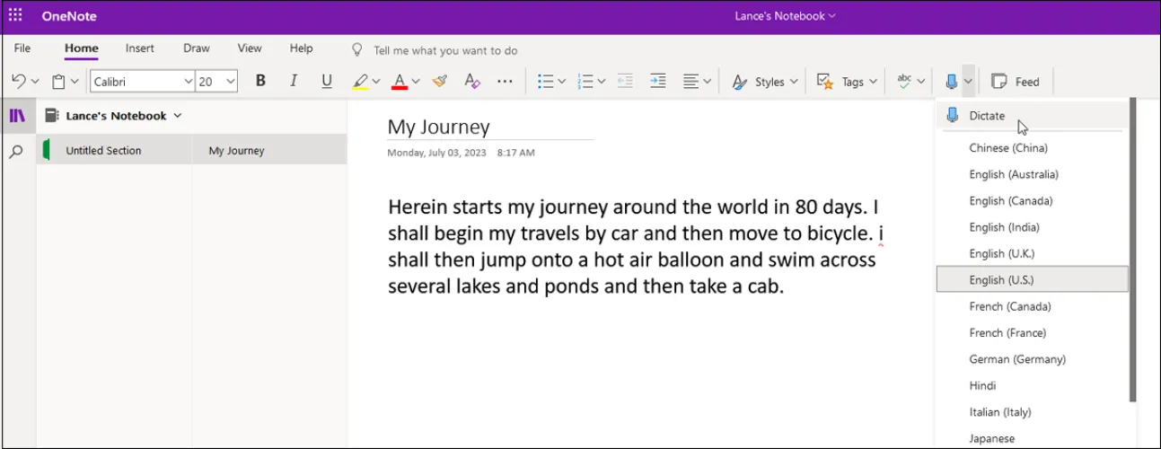 您可以在两个不同版本的OneNote中听写文本。或者转到Web上的Office