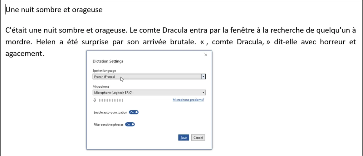 要使用转录功能,请单击口述按钮上的向下箭头,然后选择转录。要查看不同的设置并查看其他可用于听写的语言,请单击听写工具栏上的设置图标。