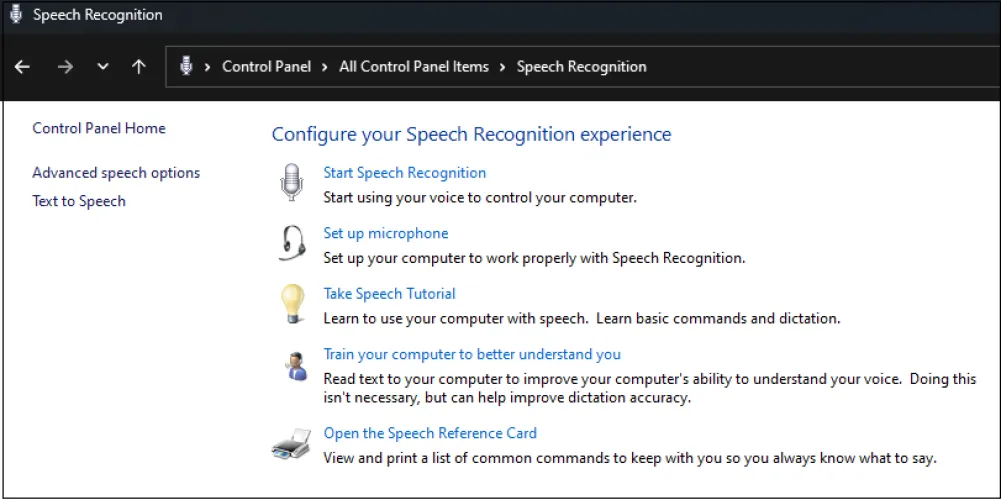 如果在Windows 10或11中打开控制面板并单击语音识别,则可以设置麦克风、训练语音识别或参加语音教程。