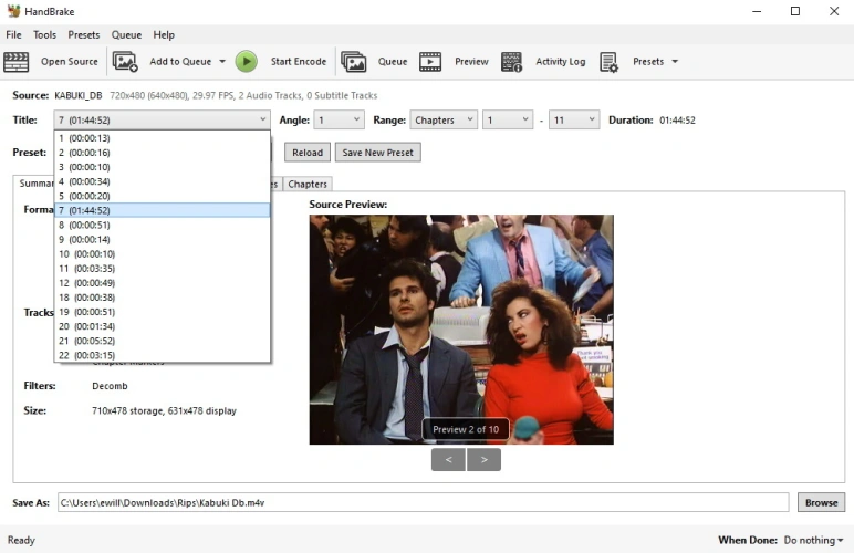 手刹可以识别光盘上的任何视频,包括菜单或预告片的视频内容。找出想要翻录的视频的最简单方法是点击标题下拉菜单,确定适合电影或节目长度的标题。如果标题只有30秒,那么它很可能是菜单内容。如果片名是1小时44分钟,那就是一部电影。